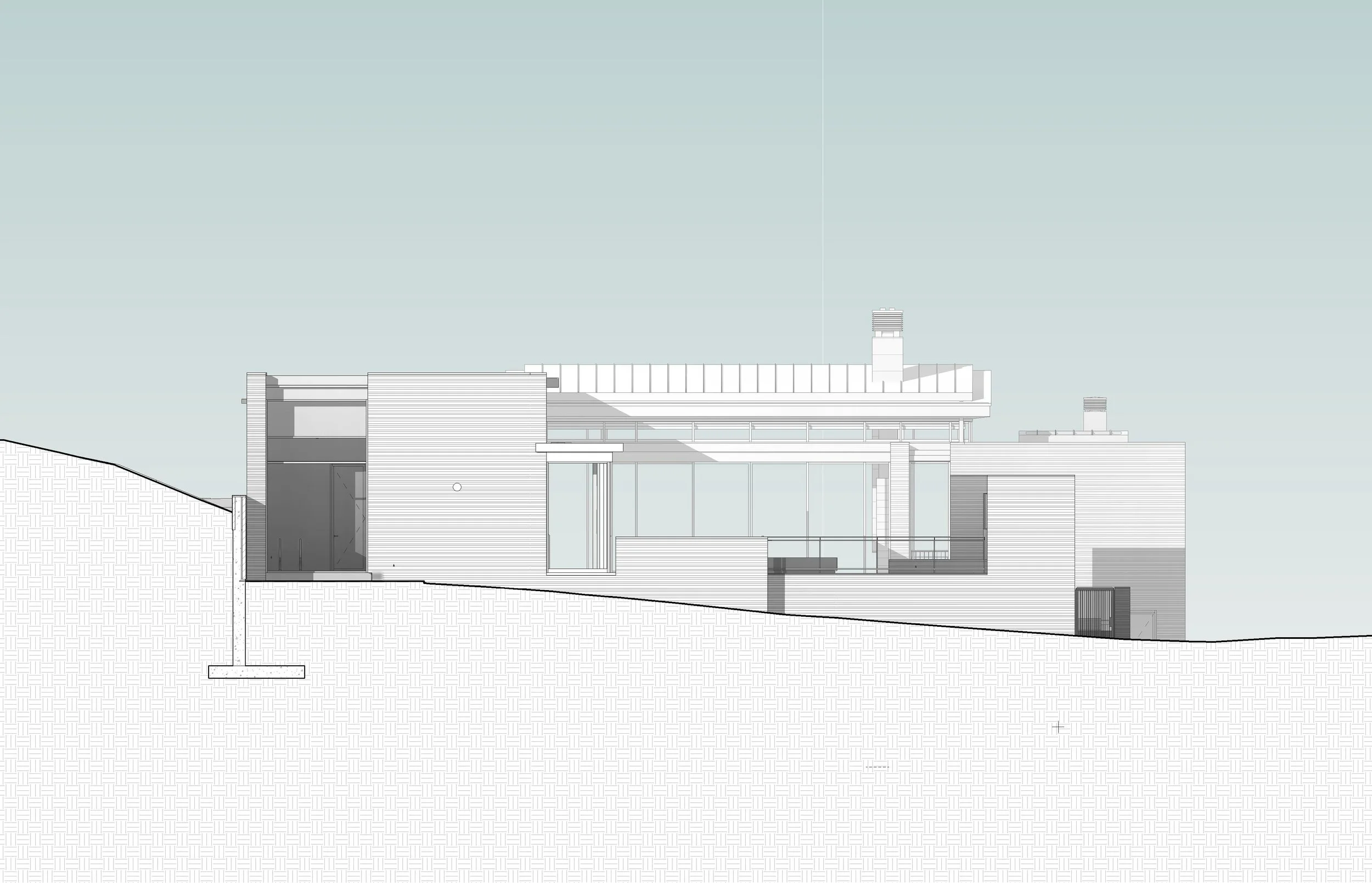 The exterior is clad in a mountain quartzite stone cut with long random lengths and 3 alternating heights. The vertical coursing and horizontal paving is cut and stacked in the same orientation as extracted from the earth. The massing is kept low as if the form grows out of the rocky mountain terrain. Triple glazed steel framed doors and windows and attention to details provide superior thermal performance. Solar photovoltaic panels on the roof and geothermal wells buried in the ground offset the energy needs.