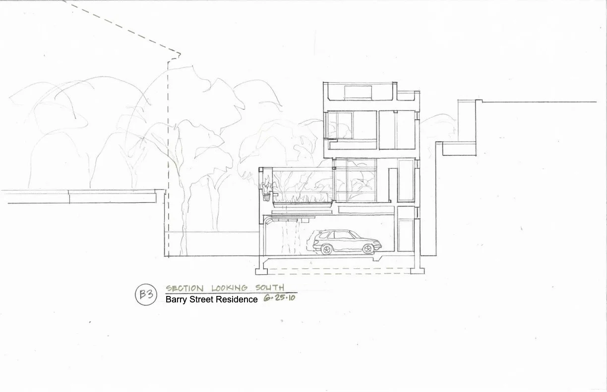 After varied design studies, 2 schemes were focused on. The first had upper floors forming an L volume around a south and east facing elevated terrace. The second had upper floors forming a 3 sided east facing courtyard on the elevated level. Aspects of both were liked and the schematic design estimate set of drawings combined them into a courtyard scheme but with the southeast quadrant visually open to maintain the transparency and openness between the exterior terrace and interior family room. The design unfortunately did not proceed beyond the cost estimate.